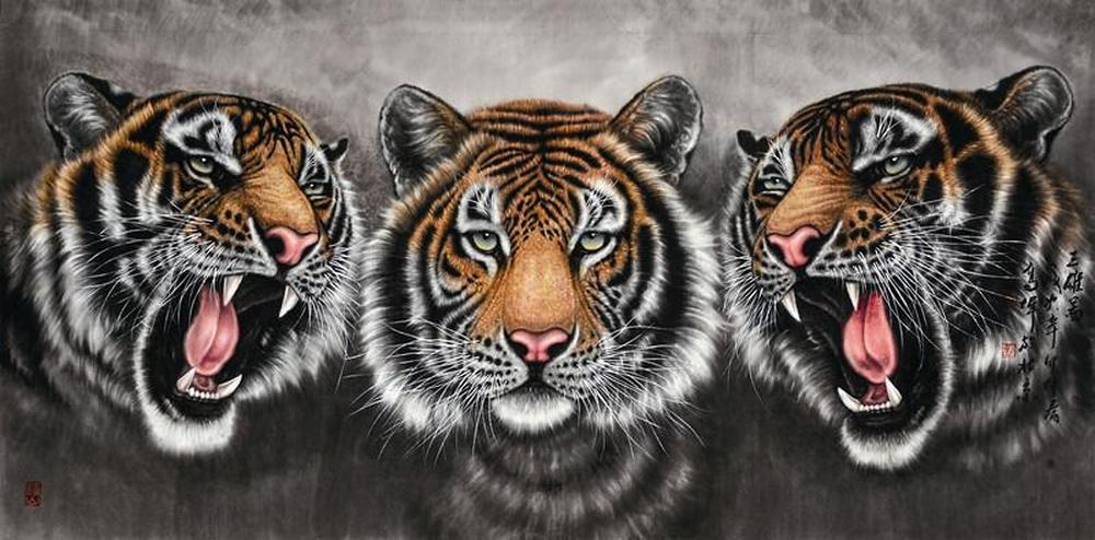 其用笔顺逆纵横,简约潇洒,自由奔放,遒劲锋利,笔下的老虎不仅是现实生活中真实动物的写照,还经过画技的技术再创造,赋予了思想感情。